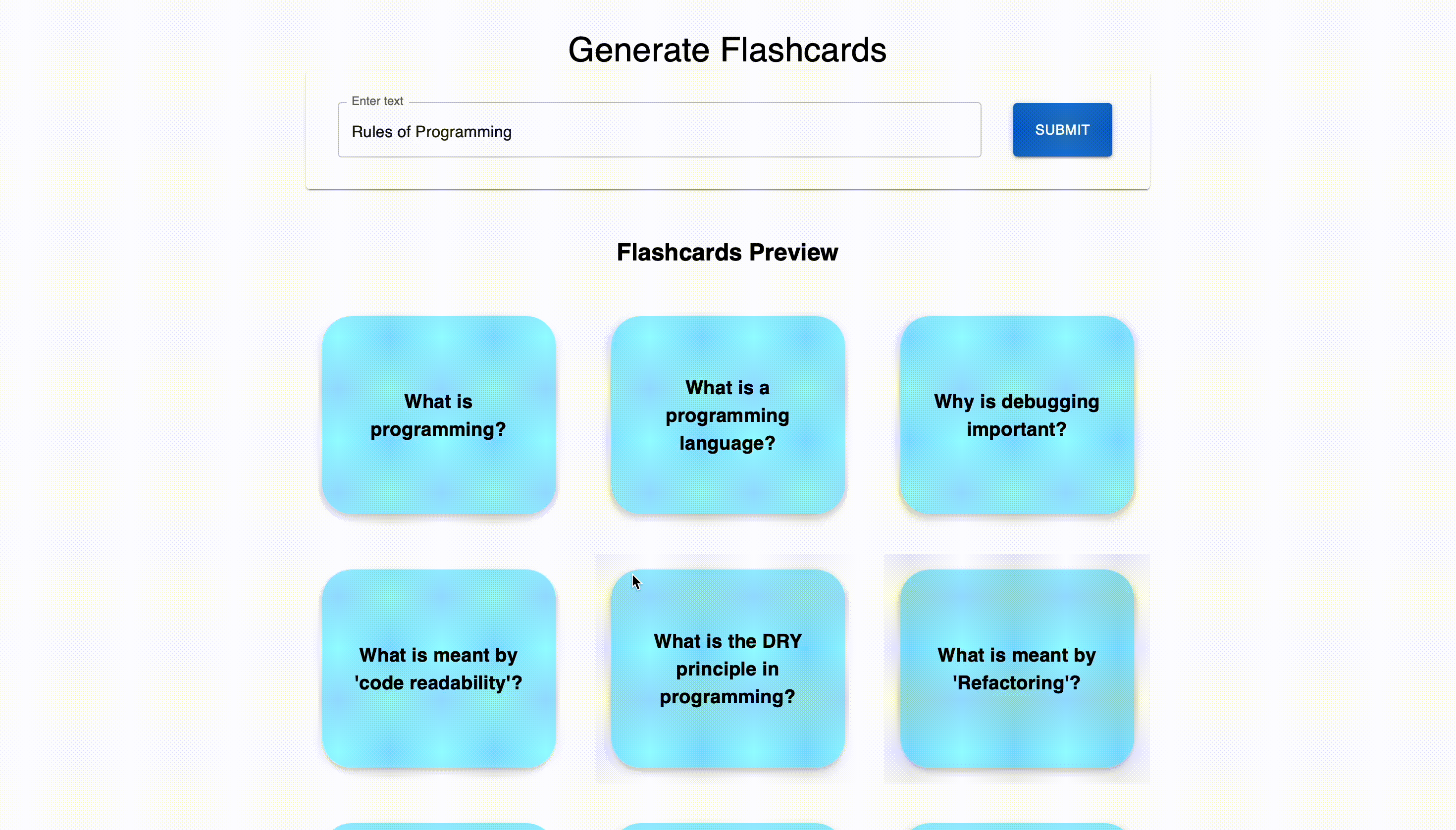 This project uses AI to generate personalized flashcards based on any topic or text the user provides. This Next.js project utilizes OpenAI API for its generation. It also includes full user authentication with Clerk, purchasing and subscription support through Stripe (though not fully implemented so you can use for free), and Firebase as the main database for storing user decks for ease of access.